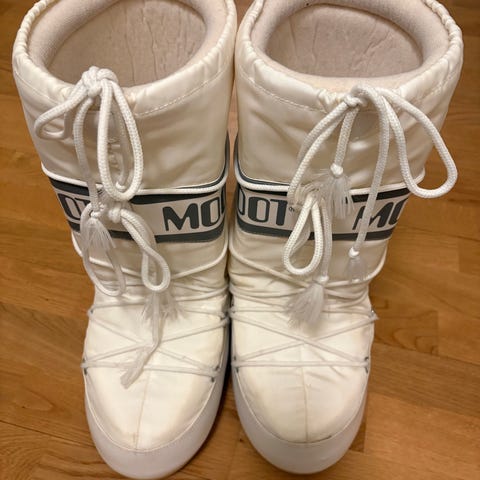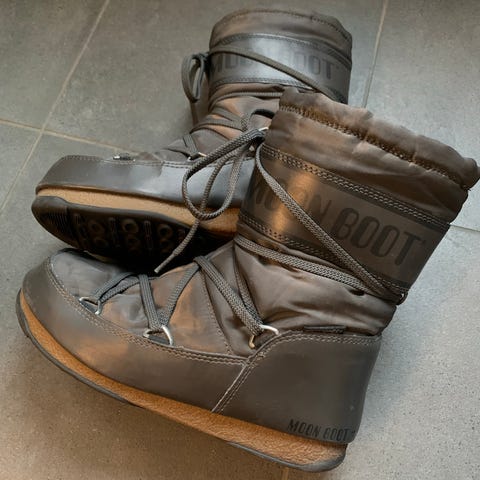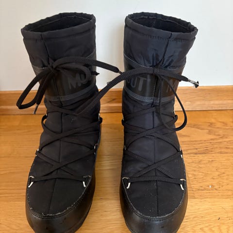 Moon Boot vinterstøvler i størrelse 39. Støvlene har svart, glansfullt yttermateriale med snøring foran og polstret skaft for ekstra komfort. Sålen er mønstret gummi for bedre grep på glatt underlag. Egner seg som varme og isolerende vintersko til bruk i kaldt vær.