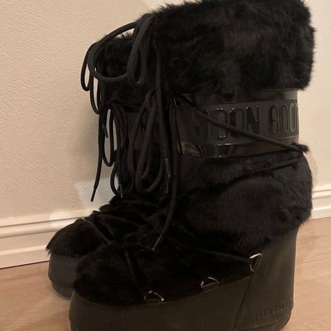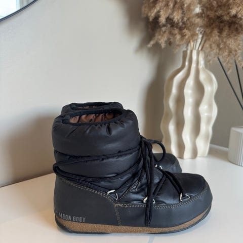 Moon Boot vinterstøvler i størrelse 36 i svart farge. Støvlene har karakteristisk snøringssystem rundt fot og skaft, samt polstret og isolert overdel som gir varme. Yttermaterialet er glatt og vannavvisende, med solid såle som gir godt grep på snø og vått underlag. Passer som varme vintersko til hverdagsbruk og fritidsaktiviteter i kaldt vær.