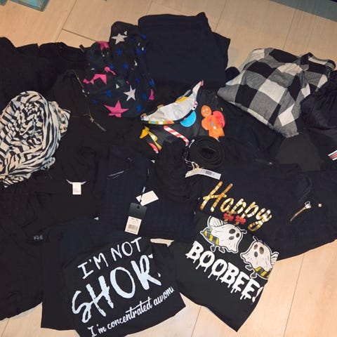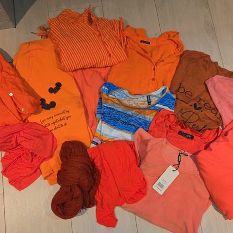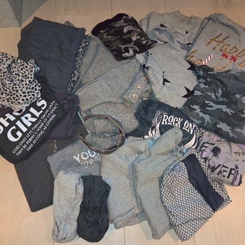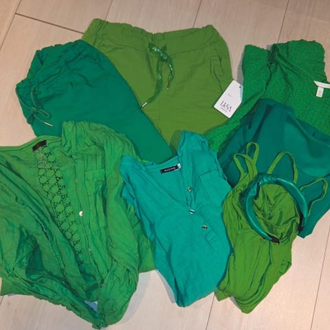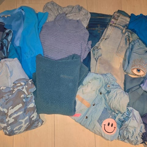 2 jakker, 3 kjoler, 3 gensere, 1 cardigan, 1 skjorte, 4 topper og 1 belte