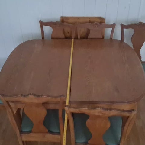 Gammel spisegruppe med massiv bord og 6 stoler.