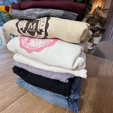 To hettegensere, to gensere, to T-skjorter, et skjørt og en bluse
