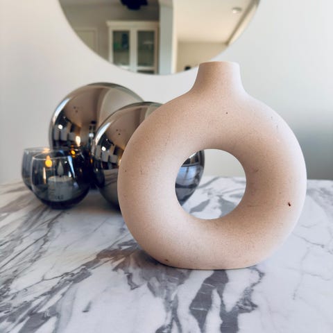 H&M Home dekorasjonsvase i keramikk med organisk form og gjennomgående åpning. Vasen har en matt, beige overflate og passer som borddekorasjon eller på hylle og vinduskarm. Egnet til tørkede blomster eller som ren pyntegjenstand i interiøret.