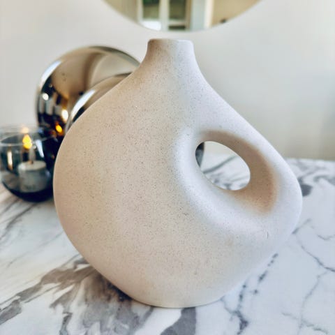 H&M Home dekorasjonsvase med rund åpning i beige farge. Vasen har en skulpturell, sirkelformet utforming med hull i midten, egnet som interiørdetalj på bord, hylle eller vinduskarm. Passer til tørkede blomster eller som ren pyntegjenstand i ulike rom i hjemmet.
