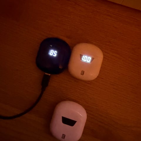 Trådløse ørepropper med ladeetui i grå farge. Modellen har et kompakt etui med lokk og to separate ørepropper i ørepluggsdesign. Øreproppene oppbevares og lades i etuiet når de ikke er i bruk. Passer til trådløs lytting til musikk, podkast og samtaler fra kompatible enheter som mobiltelefon, nettbrett eller PC, avhengig av støtte for tilkoblingsteknologi hos enhetene.