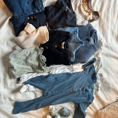 Varm klespakke med ulldress, ull body, ull bukser samt vanlig bomullsbodyer og bukser