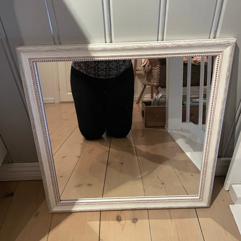 Pent, lite speil som det kun finnes ett av. Speilet er håndmalt og patinert for antikk stil, med håndlaget dekorkant øverst.
