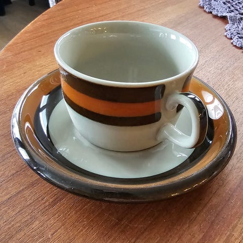 Søkeord kaffekopp kaffekopper kopp kopper underskål underskåler asjett asjetter sett kaffesett servise kaffeservise italiensk italia italy quadrifoglio ceramica keramikk steingods porselen retro vintage fargerik gul oransje striper middelhavet sommer frokost kaffepause kjøkken interiør borddekking interiørdesign kvalitet gjenbruk bruktkupp sjarmerende landlig hytteliv hytteutstyr dekor dekorasjon frokostservise lunsj kaffe espresso cappuccino 14cm