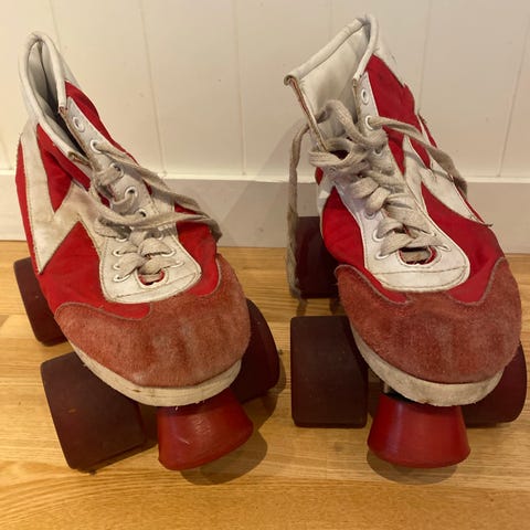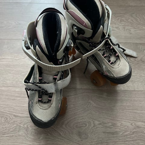 Vanlige 4-hjuls rulleskøyter, de er på undersida merket 9 1/2, men tvilsomt om det er størrelsen. Antakelig størrelse ca 36. Godt brukt, men har ennå masse glede igjen! Selges til høyeste bud. Kan naturligvis sendes, men bruker ikke Fix Ferdig.