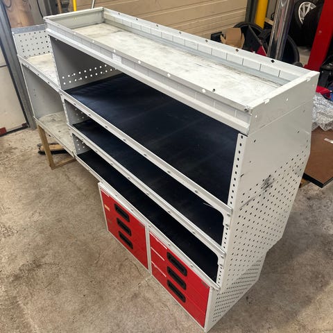 Løsningen er egnet som innredning i varebil for organisert lagring av utstyr og materiell.
