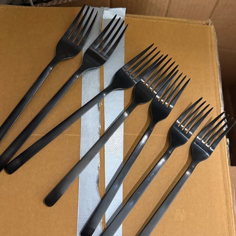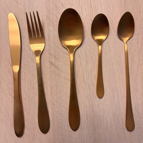 H&M Home bestikk i gullfarget rustfritt stål. Settet består av kniv, gaffel og spiseskje i ensfarget, matt metallfinish. Er til 12personer. Tåler oppvaskmaskin. Kjøpt i desember men passet ikke som tenkt! Derfor minimalt brukt! Kjøpt for 950kr, ønsker 580kr for det. Alle bud er ok men godta ett nei!😊