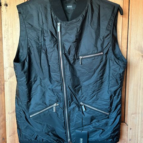 Hugo Boss vest for herre i størrelse S. Vesten er svart og laget i bomullsmateriale med vattert, quiltet design. Den har høy krage og glidelåslukking i front. Praktiske sidelommer. Passer som et ekstra lag over genser eller skjorte i overgangssesonger eller på kjølige dager.