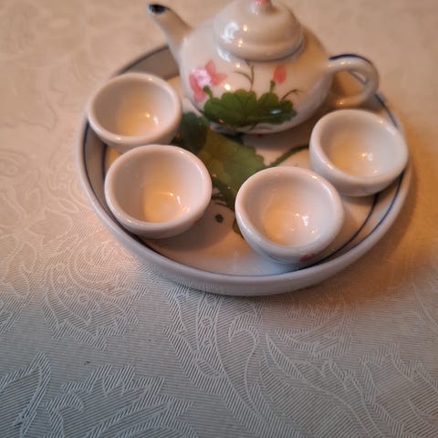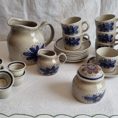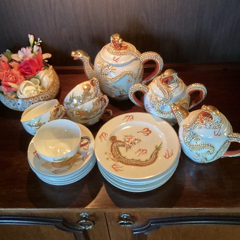 Beautiful 26-piece tea and coffee set, handmade and hand-painted with traditional floral designs. Excellent condition.The actual color is slightly darker in natural light than shown in the picture.