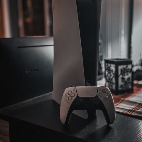 Sony Playstation 5 spillkonsoll i hvit farge. Fungerer topp og har med 2 kontrollere, en som er ganske dårlig og en bra en.