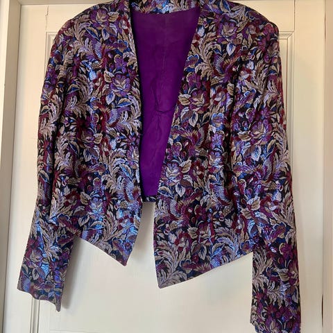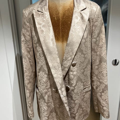 Jeg har fått sydd denne nydelige dressjakken i blankt selskapsstoff