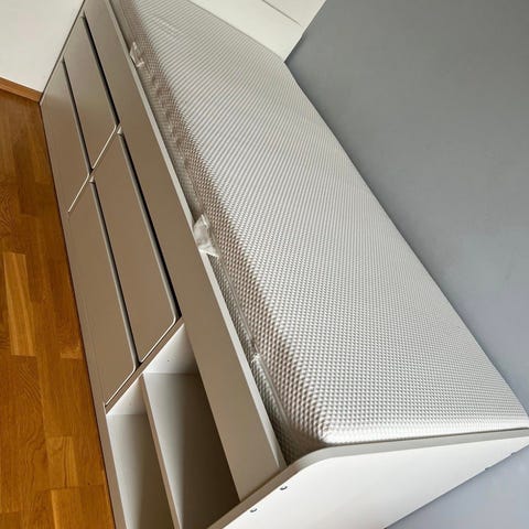 IKEA seng med tilhørende hodegavl i grå tekstil. Sengen har polstret ramme og en enkel, rett hodegavl med knappdetaljer. Passer som enkeltseng på soverom, gjesterom eller hybel. Tekstiltrekket gir et nøytralt uttrykk som er lett å kombinere med annet interiør. Oppleves myk, overmadrass bør skiftes men kan følge med og vaskes.