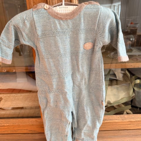 Lillelam heldress i ull i størrelse 62. Dressen er i grønn og lys stripet farge og er laget i myk ull. Modellen er unisex og har glidelås foran for enkel av- og påkledning. Ribbekanter ved ermer og ben gir en mer tettsittende avslutning. Passer til bruk inne eller som mellomlag ute for baby i størrelse 62.