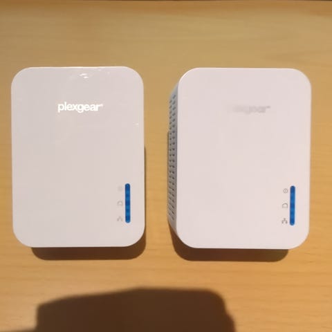 ZyXEL PLA-401 v3 router i hvit farge. Enhetene er beregnet for kablet nettverkstilkobling via strømnettet (powerline). Hver adapter har statuslamper i front og tilkoblinger på baksiden. Egnet for å utvide kablet nettverk mellom rom ved hjelp av eksisterende strømuttak i boligen eller på kontoret.