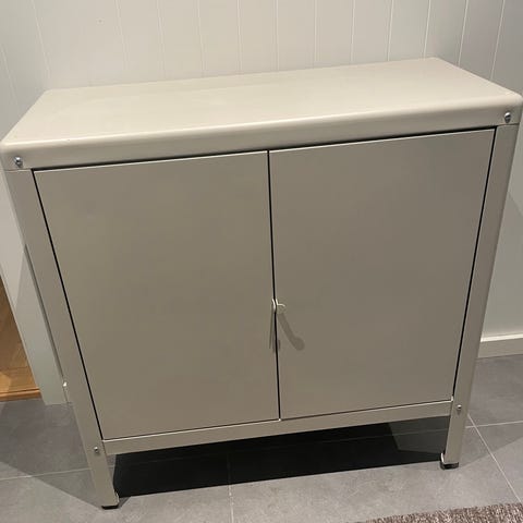 skap med dører i grå metall. Skapet står på fire rette ben og har to sidehengslede dører med enkel håndtakslukking. Innvendig er det ett sammenhengende oppbevaringsrom uten synlige hyller. Målene er ca. 60 cm bredde, 35 cm dybde og 57 cm høyde. Passer som oppbevaringsmøbel i for eksempel gang, stue, soverom eller kontor.