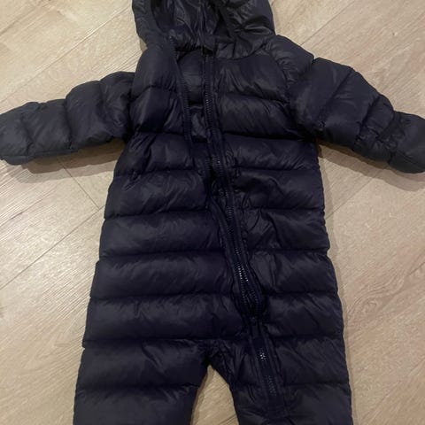 Polo Ralph Lauren dun kjeledress for barn, unisexmodell i størrelse 68. Kjeledressen er blå og fylt med dun. Den har hette og heldekkende design med integrerte votter og fotposer som gir god beskyttelse. Glidelås i front gjør den enkel å ta av og på. Egnet som yttertøy for små barn i kaldere vær.