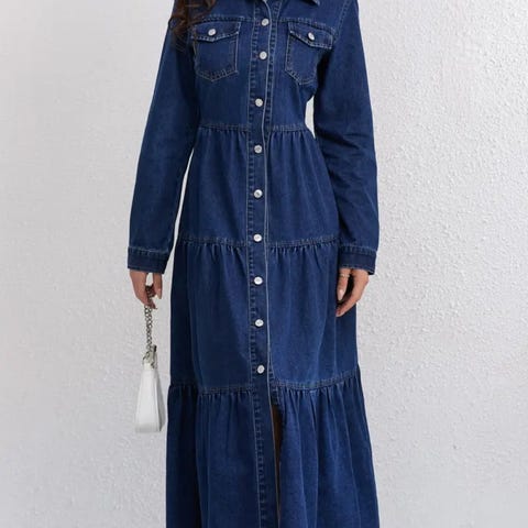Lang skjortekjole for kvinner til vår/sommer. Passer størrelse L (40/42). Modellen på bildet er 175 cm høy.