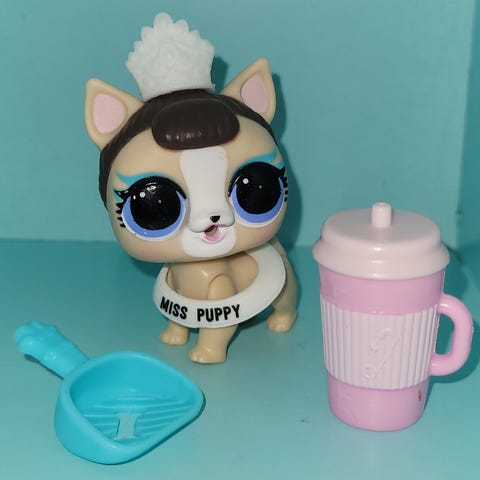 L.O.L. Surprise leketøysfigur formet som et kjæledyr. Figuren har store øyne og detaljer i rosa, blått og brunt. Med følger tilbehør som kopp/drikkeflaske og kakeformet figur. Egnet som samlefigur eller rollelek for barn som liker L.O.L. Surprise-universet. Den er òg elektrisk og det kommer med extra batterier, du kan også mate den!