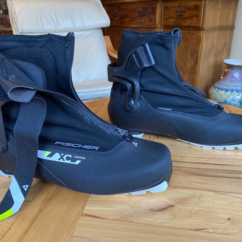 Fischer XC Control skisko i størrelse EU 43. Modellen er en klassisk langrennsstøvel med ankelstøtte og overtrekk med glidelås foran. Farge hovedsakelig svart med lyse detaljer. Såle tilpasset moderne langrennsbindinger (se bilder for detaljtype). Egnet til langrenn på tur og trening.