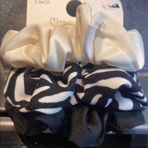 Pakke med 3 hårstrikker (scrunchies) i blå og lys blå farger. Laget av mykt stoff, egnet for å holde hår på plass.