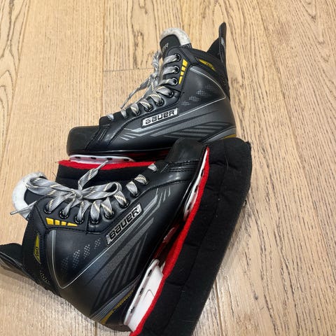 Bauer Supreme ishockeyskøyter for barn i størrelse 32. Skøytene er i hovedsak svarte med hvite lisser og hvitt understell. Overdelen er i syntetisk materiale med polstret innside og gul fôrkant for økt komfort rundt ankelen. Yttersålen er koblet til TUUK-bladholder med utskiftbare stålklinger tilpasset ishockeybruk. Egner seg til ishockeyspill og generell bruk på is for barn som trenger stabile og støttende skøyter i denne størrelsen.