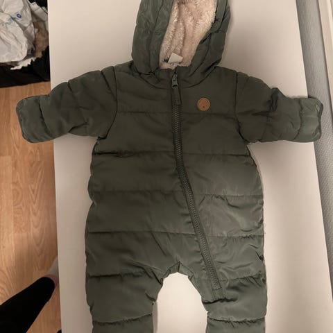 H&M kjeledress for baby i størrelse 50. Kjeledressen er beige og laget i polyester. Modellen har hette og glidelås foran. Innsiden har mykt, pelsliknende fôr for ekstra varme. Egnet som yttertøy for spedbarn i kjøligere vær.