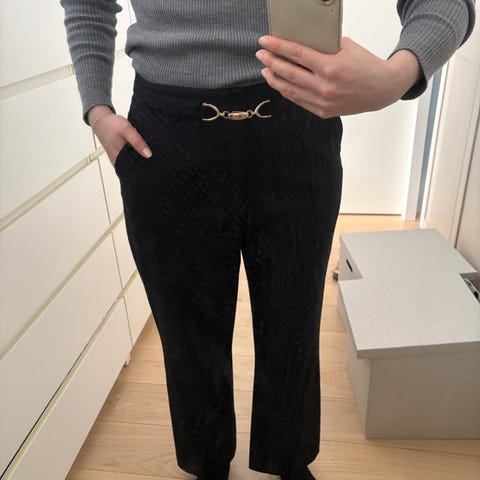 Buksen har beltehemper, stikklommer i sidene og lukkes med glidelås og hempe foran. Normal i størrelsen, og svært lite brukt da den ikke passer.