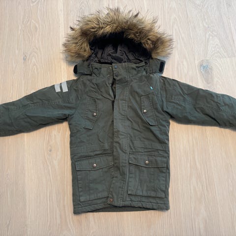 Wheat Vinterjakke for barn i størrelse 128. Jakken er grønn/grå. Den har hette med pelskant og er designet for å gi varme og beskyttelse i kaldt vær. Brukt av kun ett barn..
