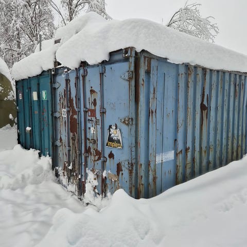 20 fot container på krokramme. 2 rom Med hyller og enkel innredning. Pris er eks mva. Behjelpelig med transport