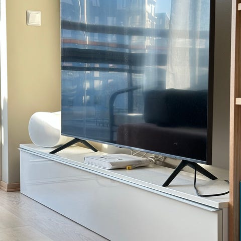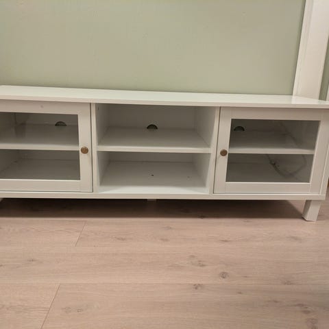 Praktisk og elegant TV-benk i hvit utførelse med glassfronter og romslige hyller. Den gir god plass til TV-utstyr og tilbehør, samtidig som den holder det organisert og oversiktlig. I god stand.