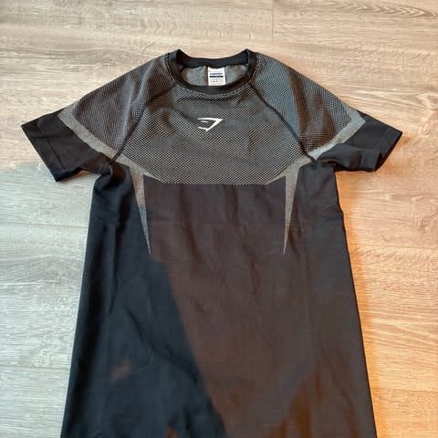 Gymshark trenings T-skjorte for herre i størrelse S. T-skjorten er svart med Gymshark-logo på brystet. Materiale ifølge lappen: 73 % nylon, 21 % polyester og 6 % elastan. Passer til fitness og annen trening. Kort erm og rund hals.