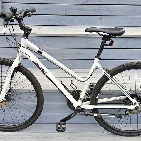 Sykkelen har blå ramme i størrelse M og dempegaffel foran.