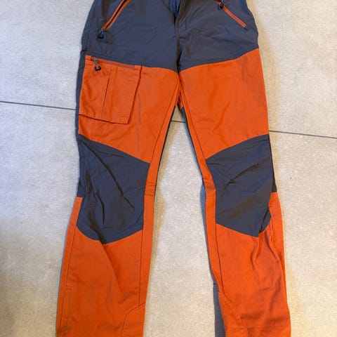 Lundhags turbukse i oransje med mørkegrå forsterkningsfelt over knær og sete. Buksen har glidelåslommer på lårene og justerbar nederkant med trykknapper. Egner seg til friluftsliv og turbruk. Materialet fremstår som et slitesterkt stoff med ekstra forsterkninger på utsatte områder.