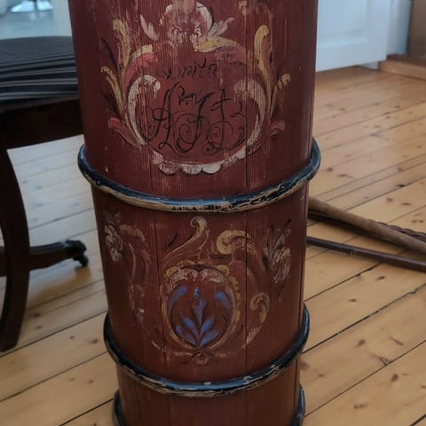 Håndmalt trefat med rosemaling på tilhørende stativ. Fatet er dekorert med tradisjonelle rosemønstre i flere farger og har tekst på fronten. Det står på et tilpasset trestativ som gjør at fatet kan plasseres på gulv eller bord. Egner seg som dekorasjonsgjenstand eller til bruk som pyntefat i interiør med tradisjonelt eller nostalgisk preg.
