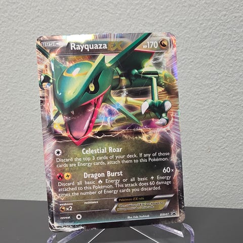 Tyranitar ex 64 fra settet Pokemon Prismatic Evolutions, rett fra pack til sleeve.