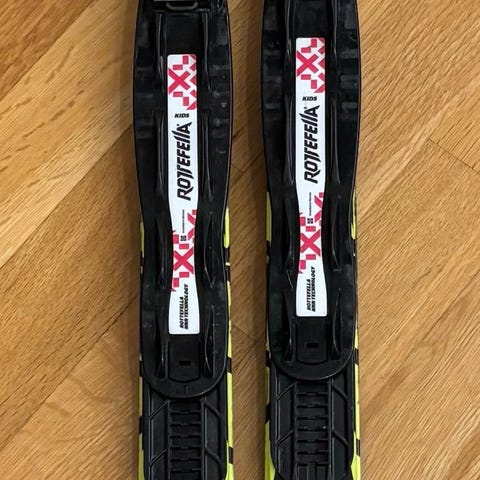 Skiene er pent brukt. Oversiden har normale bruksmerker, og sålene er jevnt vedlikeholdt. Bindingene fungerer utmerket.