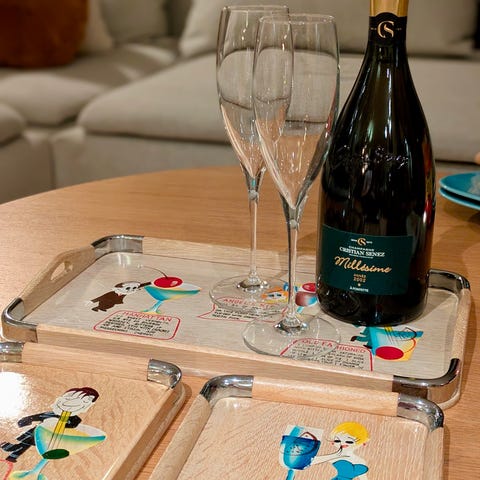 Vintage cocktail-brett fra 1950-tallet. Brettene er laget av tre med metalldetaljer og er dekorert med håndmalte motiver av tegneserieaktige figurer og klassiske cocktailoppskrifter.