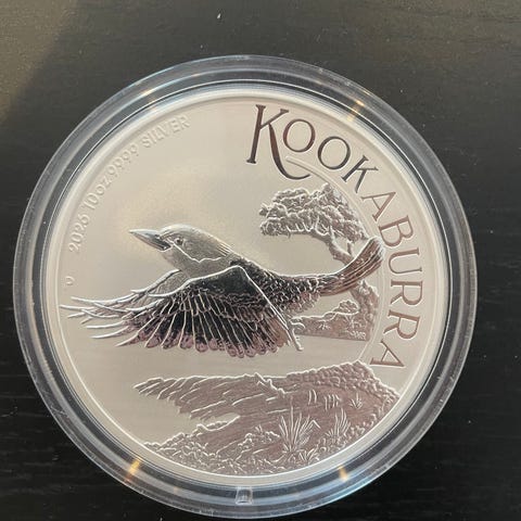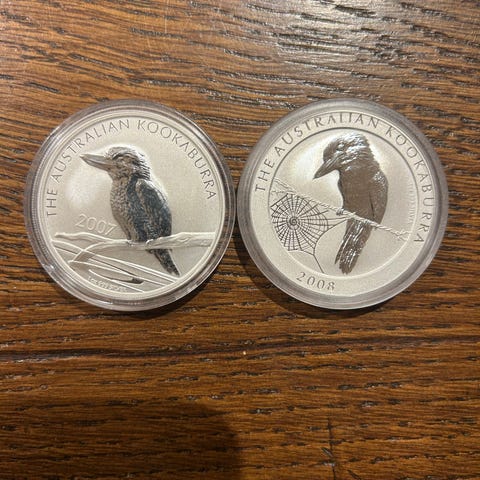 Australske kookabura 2 dollar, 2oz, 999 silver selges. Den er fra 2004/2005