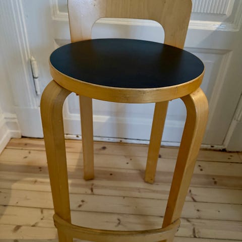 Selger 4 stk. Artek 611 stoler designet av Alvar Aalto. Ramme i klarlakkert bjørk og sete/ rygg i svart sadelbånd (nye bånd montert hos møbelsnekker i 2022). Modellen er stablebar (se bilde) og sittehøyden er 43,5 cm. Koster ny i butikk ca 9000,- pr. stol.