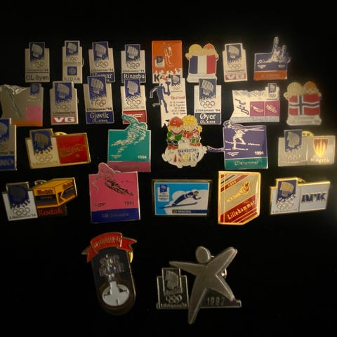 Blandet parti med ulike vintage pins. Motivene varierer, blant annet reklame, figurer og symboler. Flere av pinsene ligger i separate plastposer. Egner seg for samlere eller til bruk på klær, vesker eller lignende. Antall, årstall og produsent er ikke spesifisert.