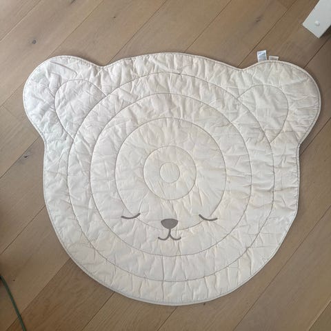 Liewood rund lekematte med bil- og kjøretøymotiv. Myk, quiltet matte som egner seg som underlag til lek på gulv. Nøytral, lys bunnfarge med påsydde detaljer i flere farger. Kan brukes på barnerom, lekehjørne eller under babygym.