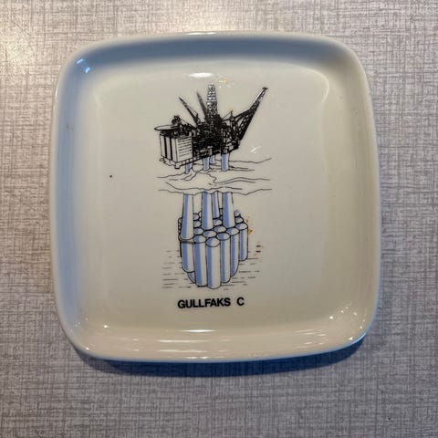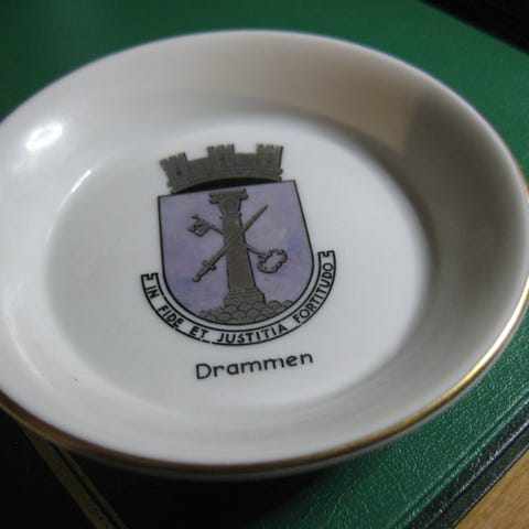 Selger et samleobjekt i form av en porselensfat eller askebeger fra Porsgrunds Porselænsfabrik.