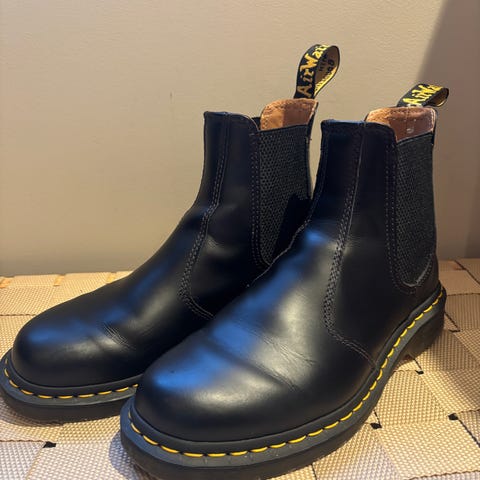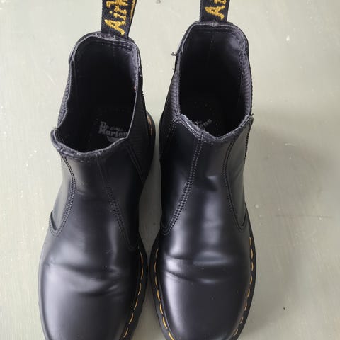 Dr. Martens Chelsea støvler i størrelse 39. Støvlene er ensfarget svarte og laget i skinn med overdel i lær og dekksåle i lær. Sålen er i slitesterk gummi. Modellen har rund skotupp, lav hælhøyde og lav skaft høyde, med elastiske strikkfelt i sidene for enkel av- og påkledning. Innermaterialet er fôret i en kombinasjon av lær og tekstil med tynt fôr. Passform med vanlig skovidde. Egner seg som hverdagssko i ulike sesonger.
