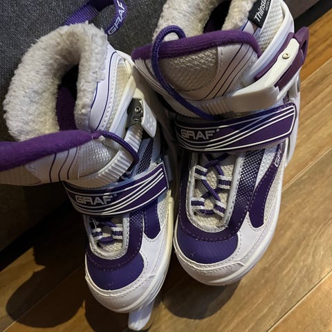 Graf regulererbare skøyter til barn. Størrelsen kan justeres fra str 31-34. Veldig lite brukt, men noen få år siden de ble kjøpt.