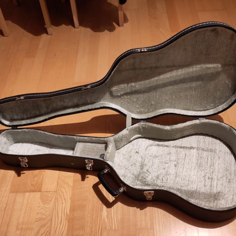 Gitarutstyr gitarkasse hardcase i koffertutførelse. Ytre overflate i strukturert materiale med kontrastfarget kant og metallbeslag. Innvendig polstret med mykt, mørkt fôr for å beskytte instrumentet. Egnet for oppbevaring og transport av gitar. Flere låser og håndtak på siden for trygg lukking og bæring.