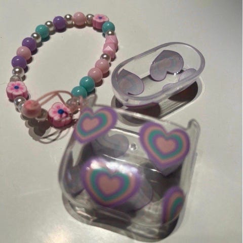 nøkkelring. Dekselet har dekorative elementer i lilla farge og er laget av plastmateriale.