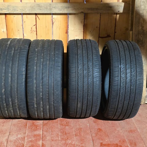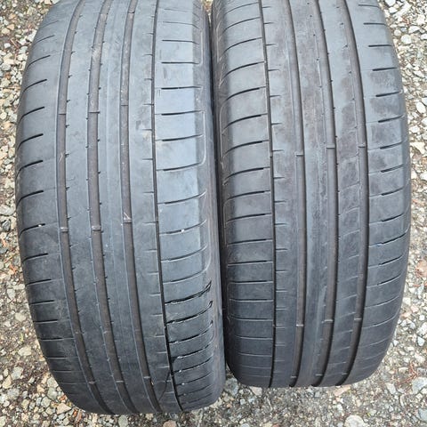 Begge dekk selges som de er. Det ene dekket har en skade i kordlaget på innsiden. Skaden er synlig, og kjøper oppfordres til å vurdere dette nøye før kjøp. Dekkene har holdt luft sist de var i bruk, men selges uten garanti. Pris gjelder for begge dekkene.